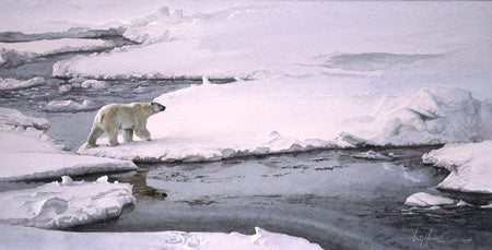 This fine art print of Sir Wally’s original watercolour painting is of a solitary polar bear, traversing polar pack ice.