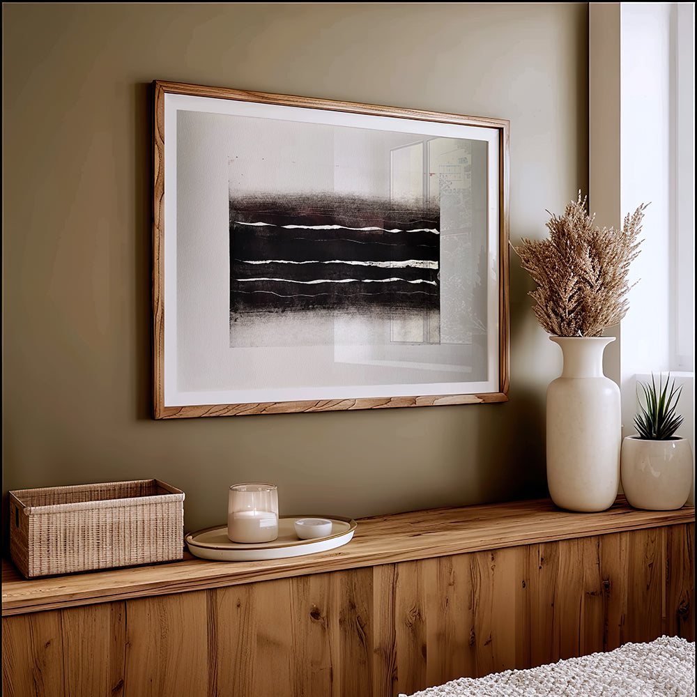 This 1 of 1 monoprint by Kari Herbert is an elegant, dramatic abstract artwork evoking the feeling of breathing by the sea. Each sweep of ink, each scrape and mark describes the inhale and exhale of breath; the rush and retreat of the waves.